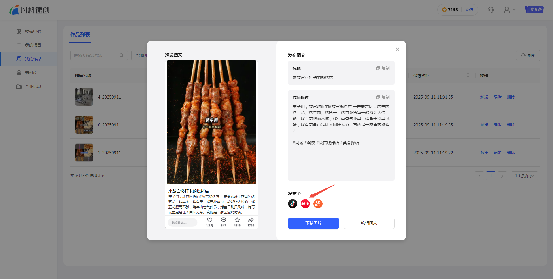 点击【保存至我的作品】,可以将您喜欢的作品直接保存到“我的作品”库,以便后续到小红书等平台上发布。