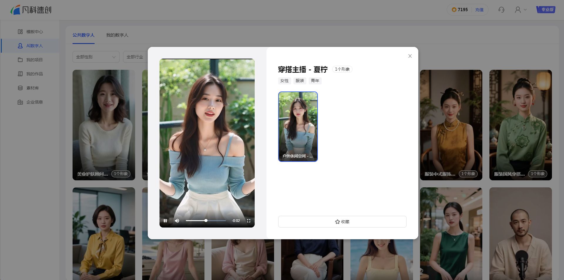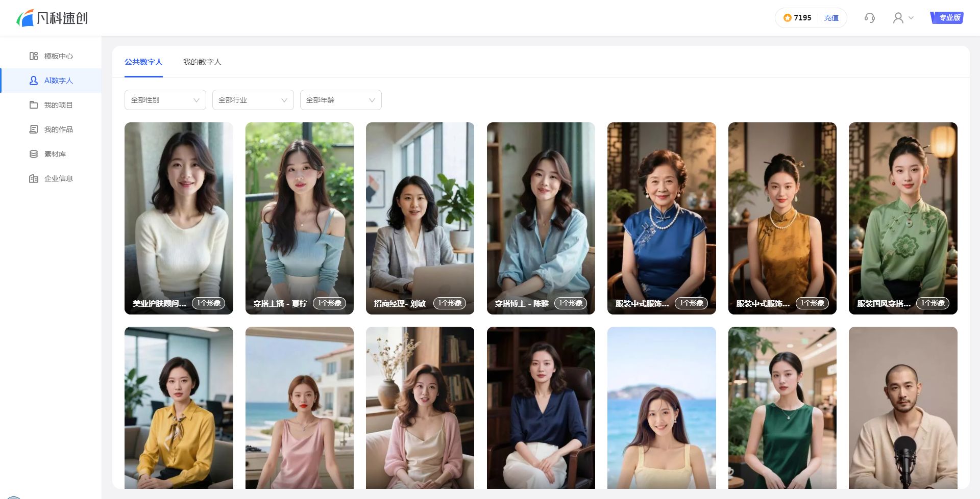 2. 在“公共数字人”标签页,可按性别、行业、年龄筛选所需数字人形象。点击列表中的数字人可预览效果,支持收藏。