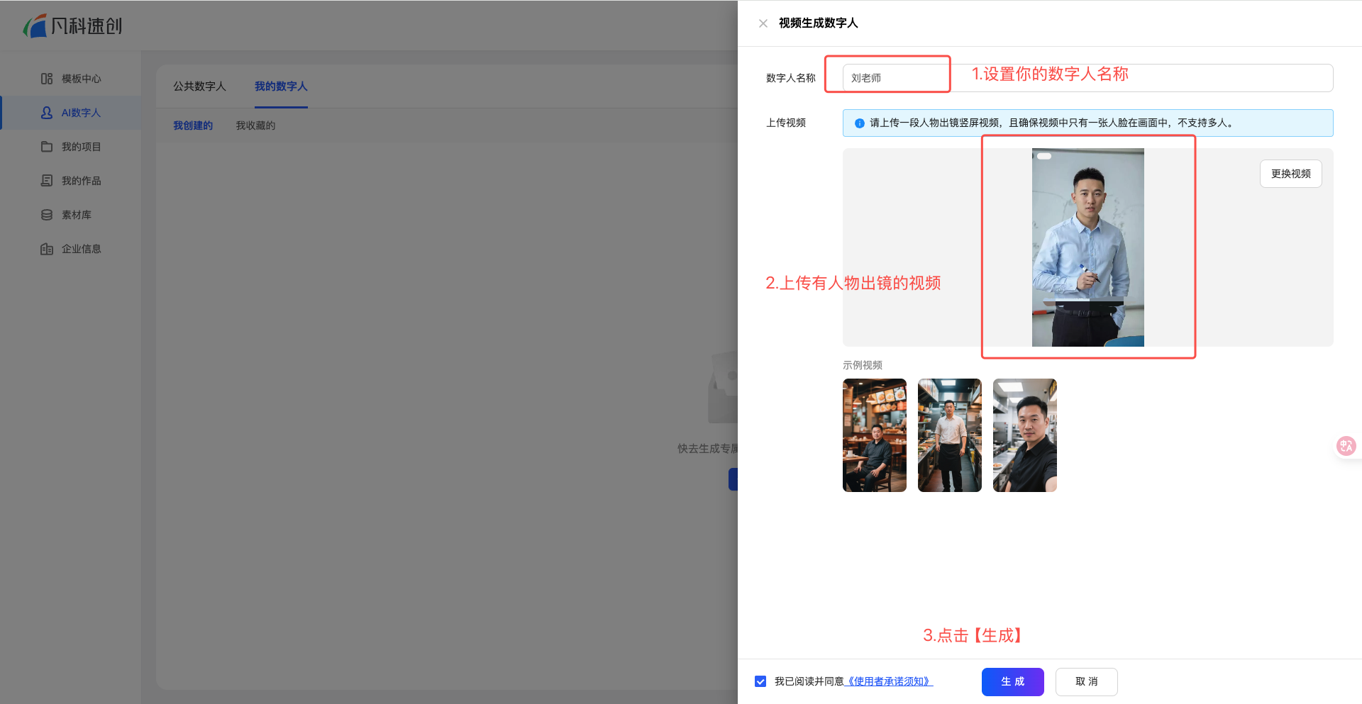 3. 生成专属数字人(需上传视频训练)