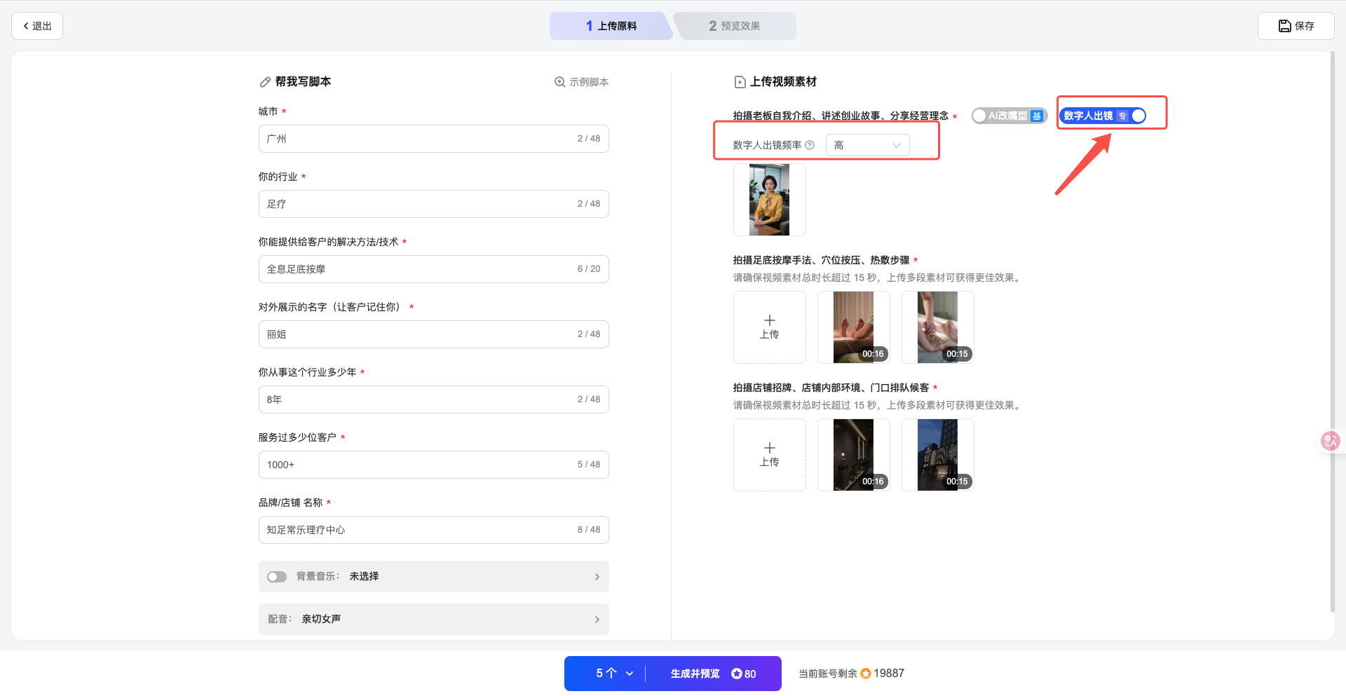 进入项目编辑器,在“上传原料”步骤中,开启【数字人出镜】开关。在弹出的数字人选择框中,选择已生成的专属数字人或公共数字人。设置数字人出镜频率(高频/低频)、数字人的音色可以在编辑器左侧的【配音设置】中进行选择和调整,系统将根据脚本自动插入数字人口播片段。
