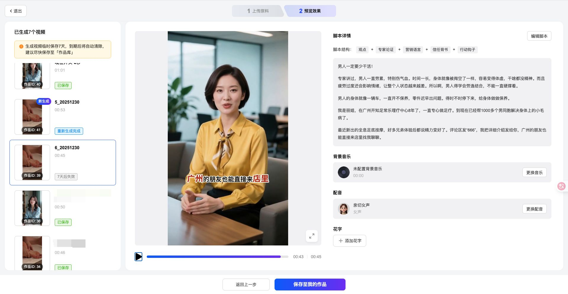 5.点击【生成视频】,成片中将包含数字人出镜画面。注意:当前暂不支持自定义出镜时长和位置,系统会根据脚本内容自动分配。