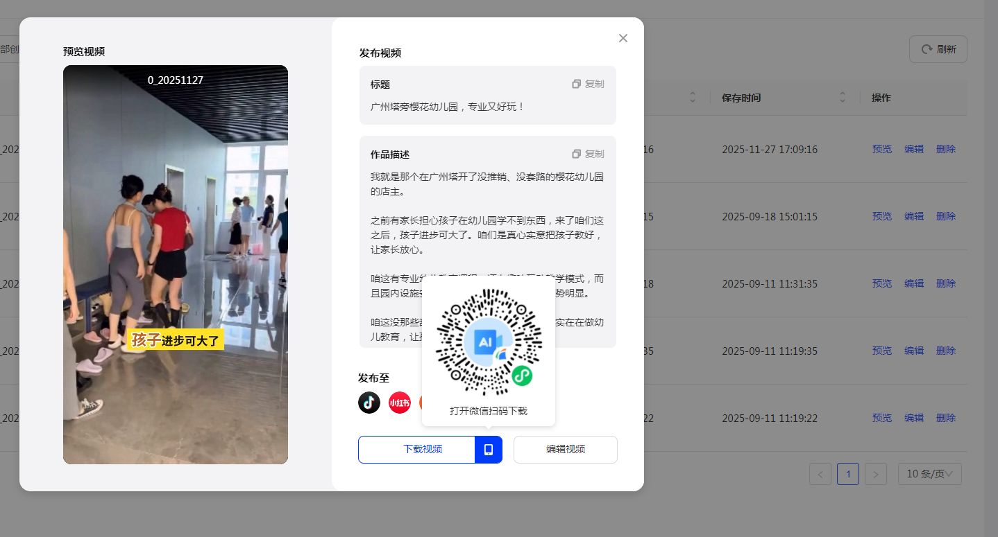 【预览-预览视频作品】,支持在预览页面点击【下载作品】,或可使用微信扫码通过小程序下载作品文件,并支持复制标题和文案。