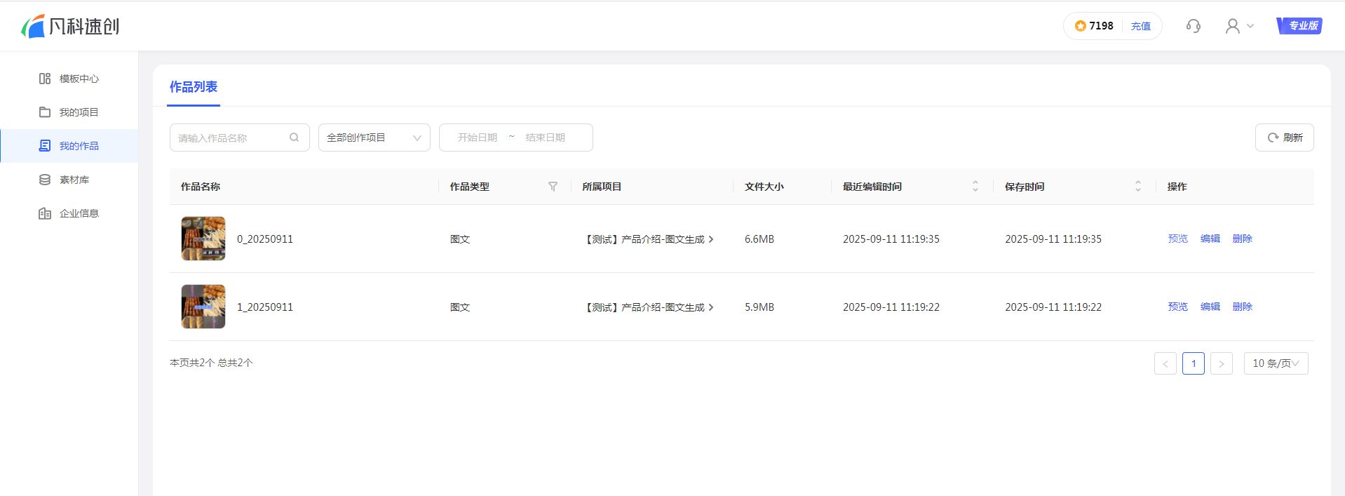 在每行作品的末尾“操作”列下,按需使用【预览】、【编辑】、【删除】按钮,方便您对单个作品进行管理。