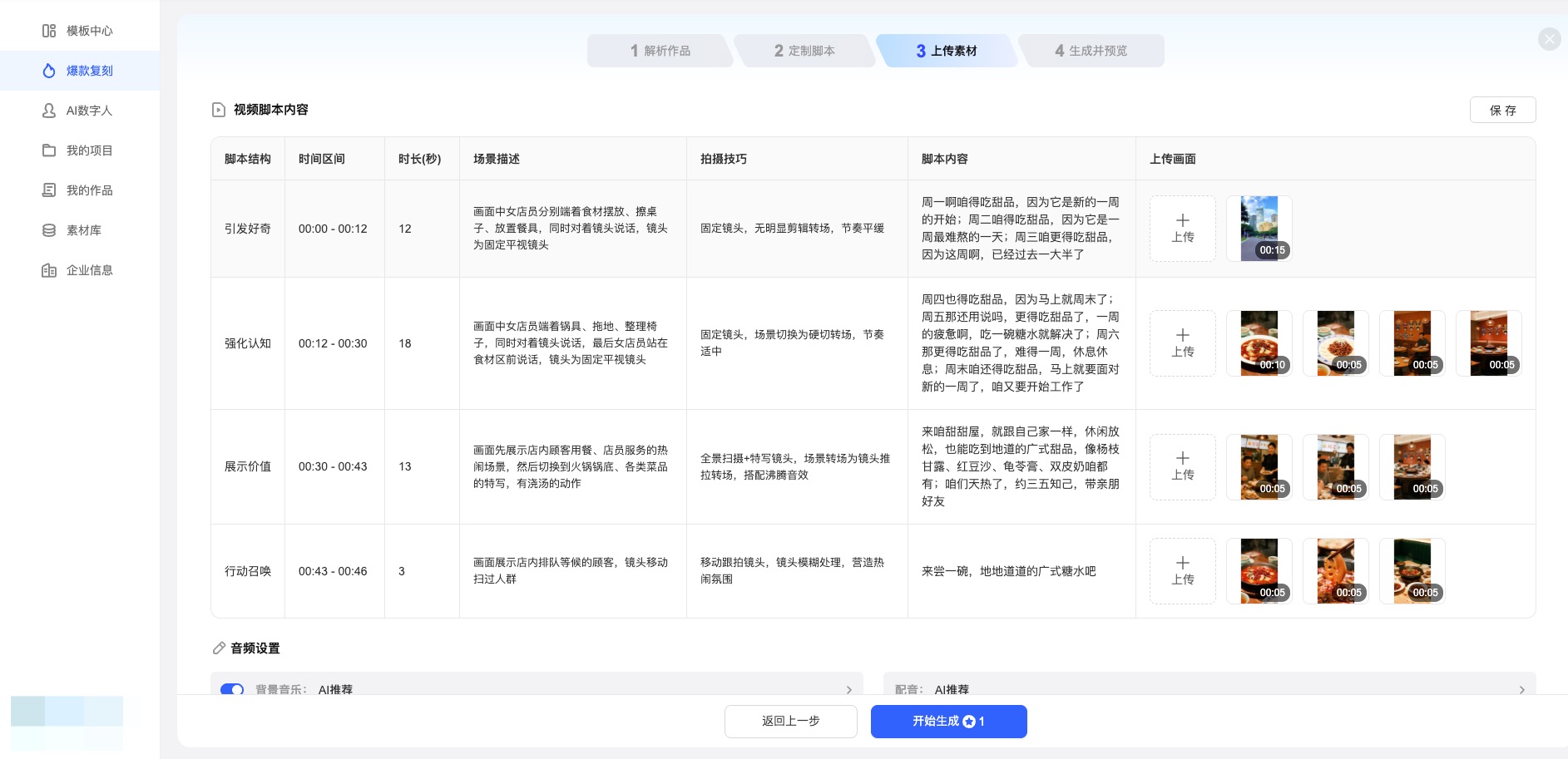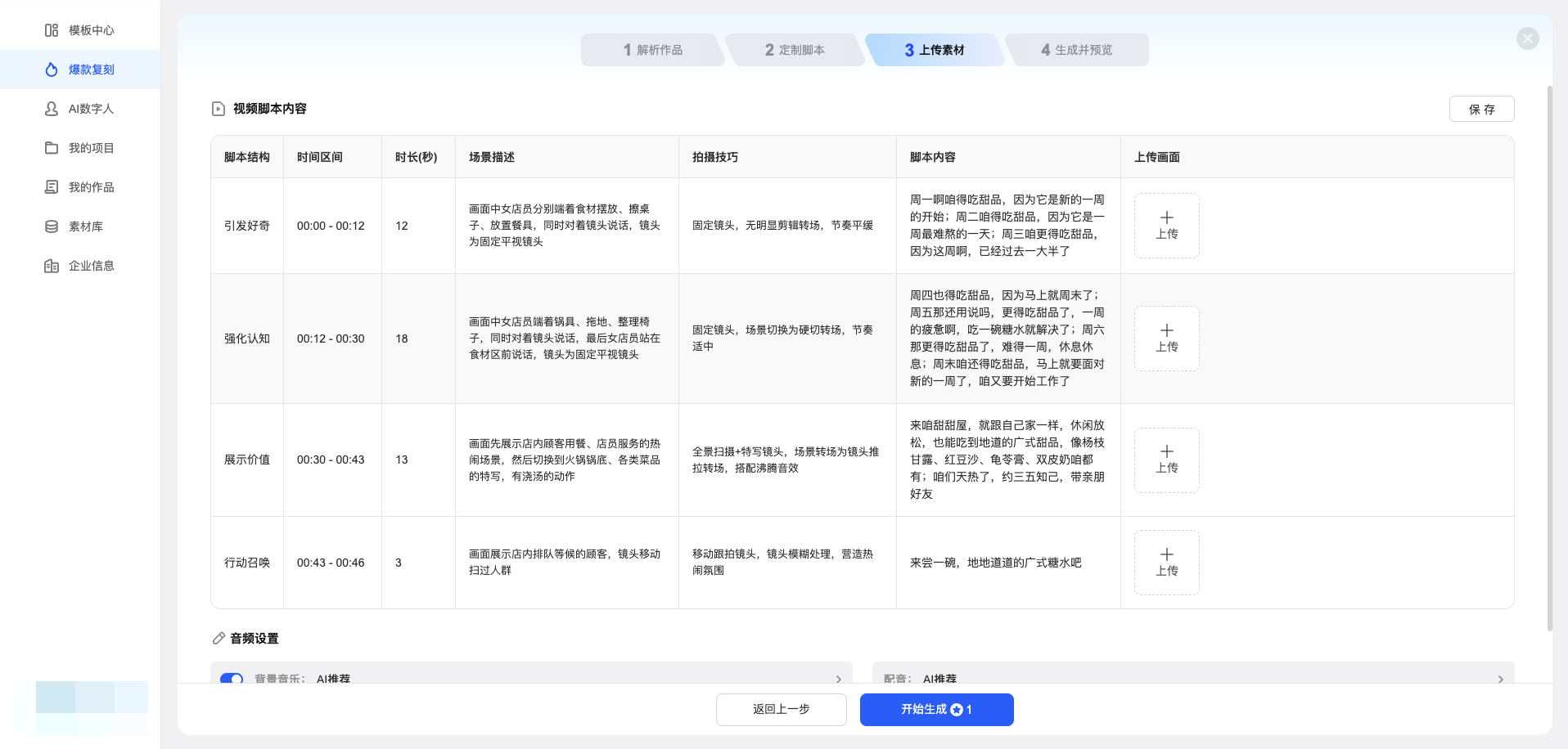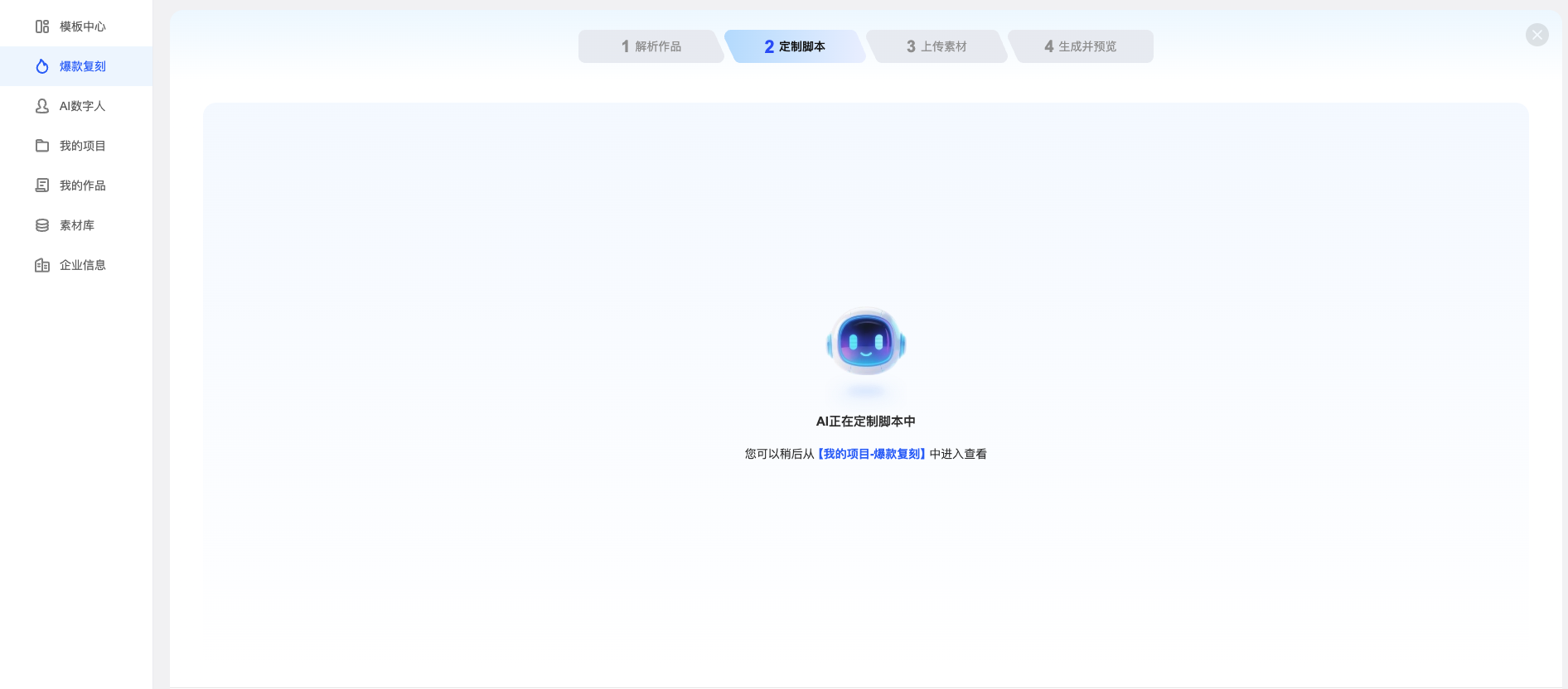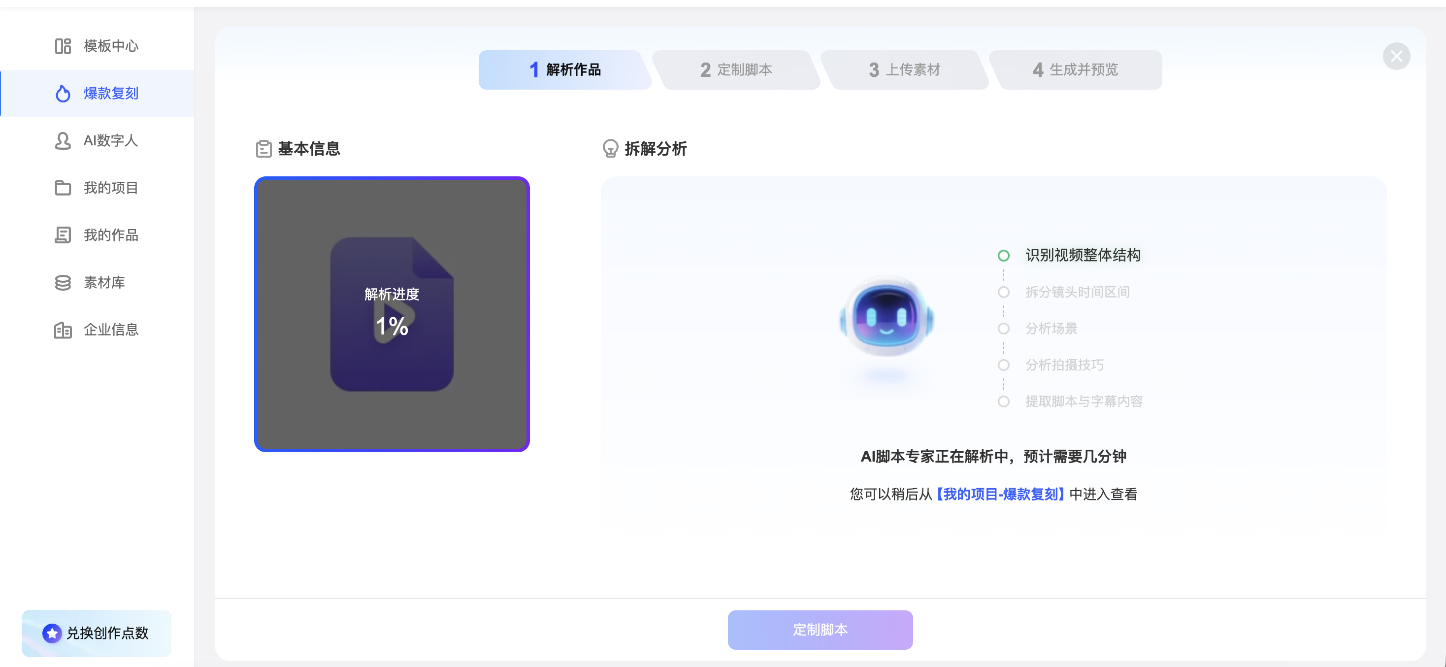 提示:页面上方有步骤条(如:1 解析作品 → 2 定制脚本 → 3 上传素材 → 4 生成并预览),跟着走即可。