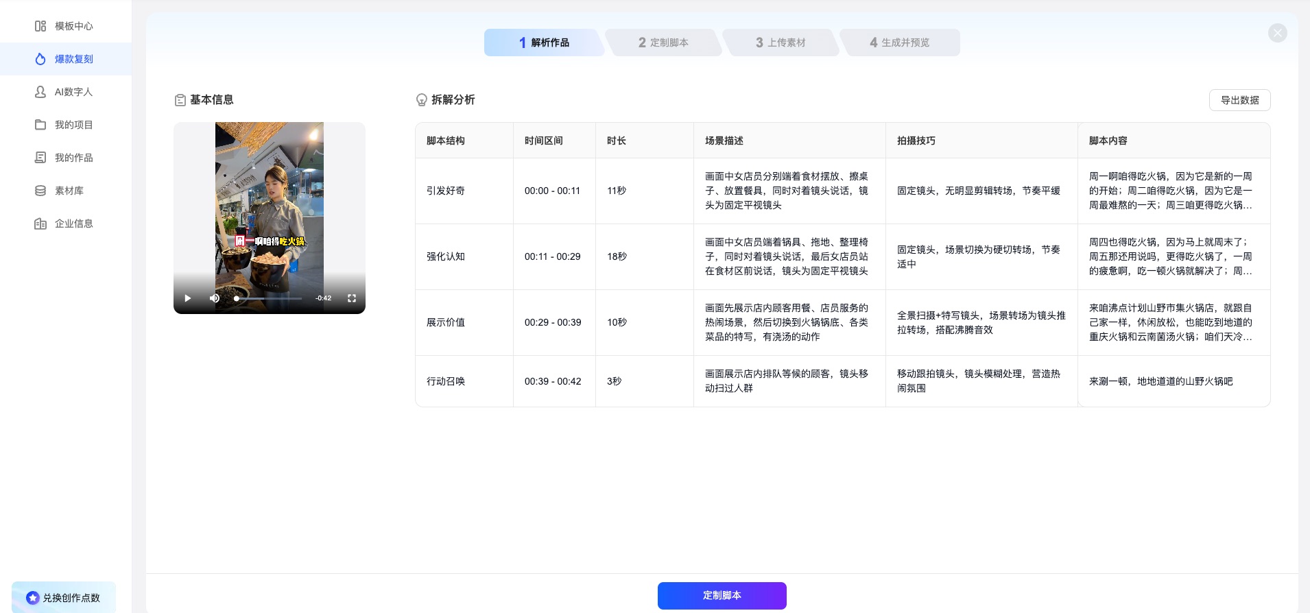 解析完成后,你会看到参考视频被拆成结构化表格(脚本结构/时间区间/时长/场景描述/拍摄技巧/脚本内容等)。