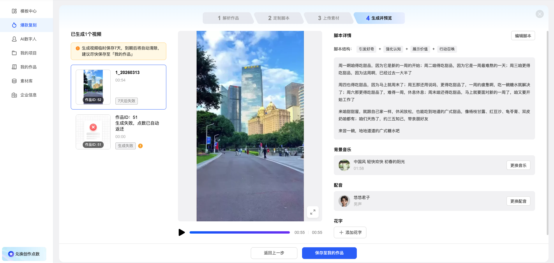 生成完成后进入「生成并预览」,左侧为作品列表,中间为视频预览,右侧可查看脚本详情并调整背景音乐/配音等。
