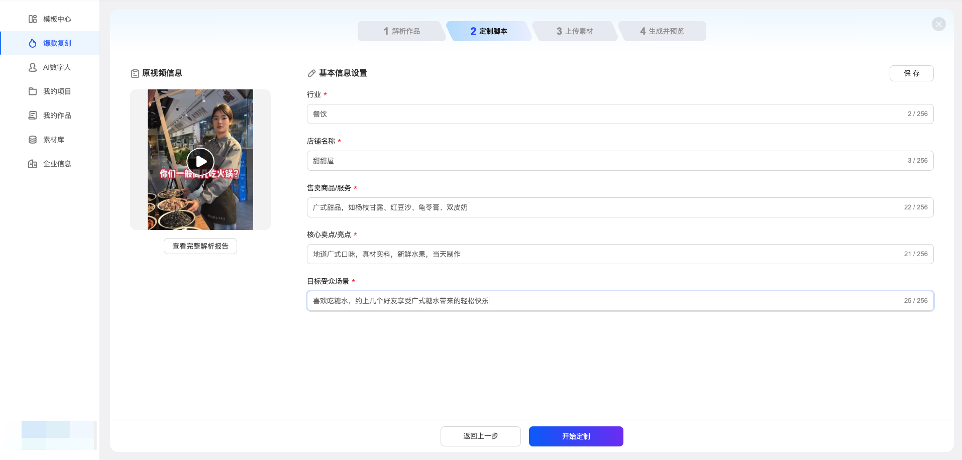 在「定制脚本」页填写你的业务信息(如:行业、店铺名称、售卖商品/服务、核心卖点、目标受众等),然后点击「开始定制」。