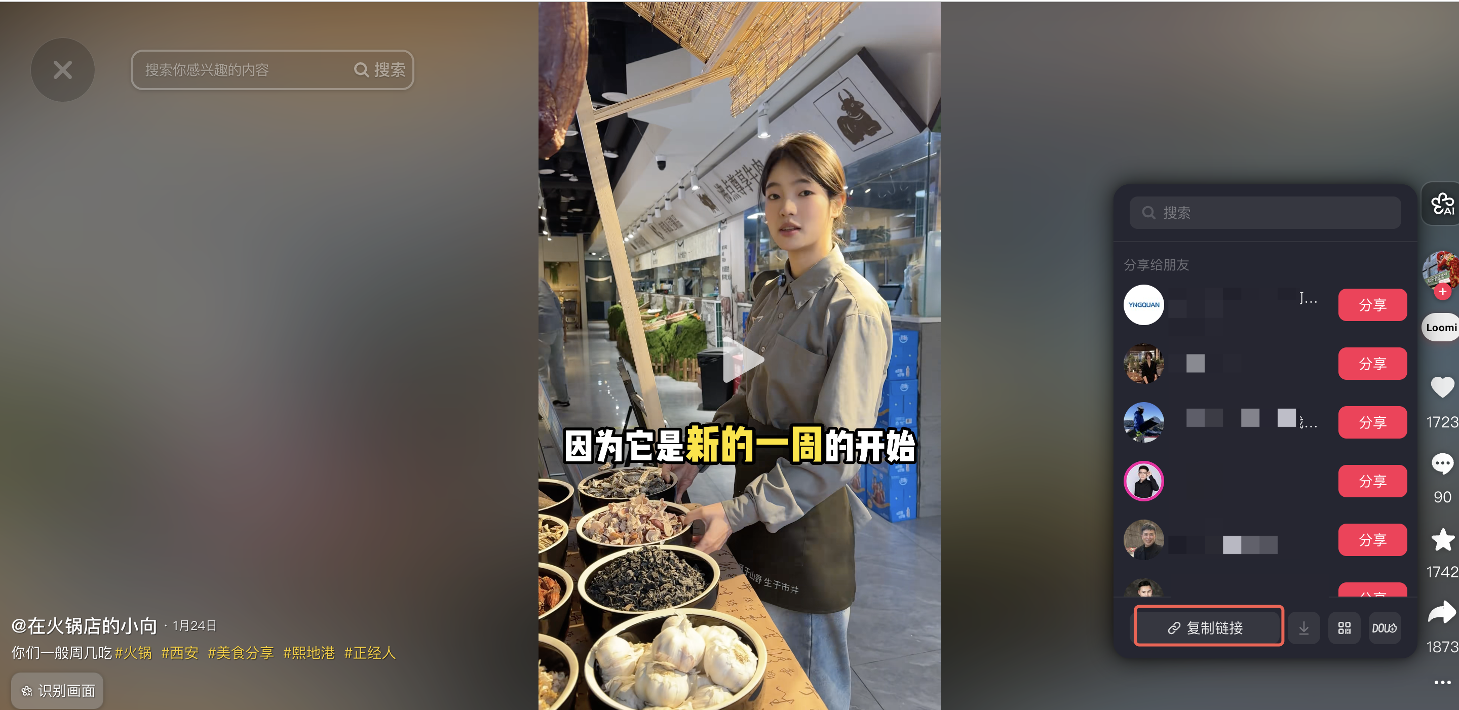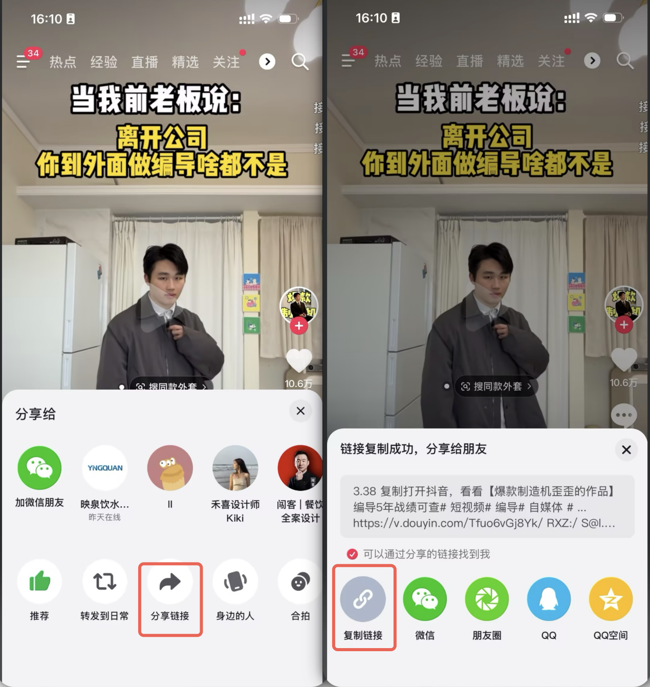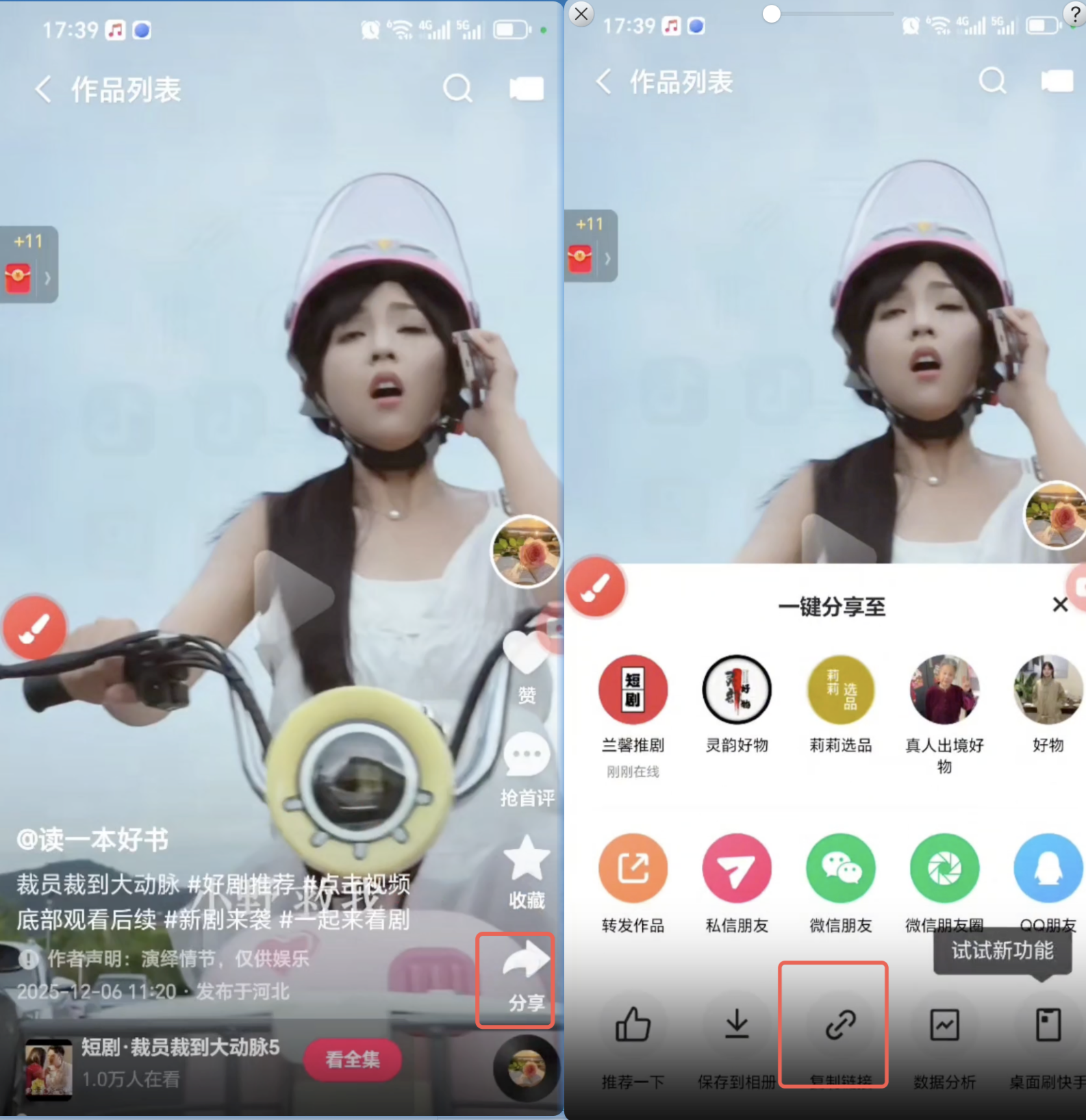 点击视频右下角【分享】→【复制链接】获取链接,适合批量操作场景。