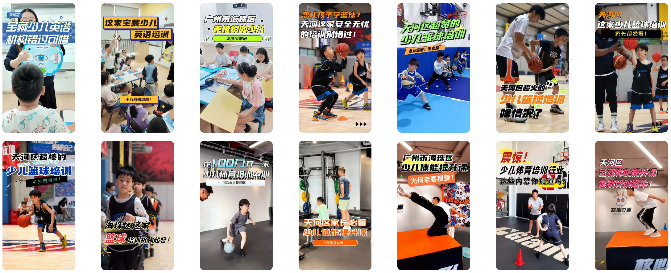 而教培行业的模板细分也是一样,从少儿篮球培训到美术培训,从体能提升到游泳课程,每个细分领域都有针对性的内容模板。这些模板充分考虑